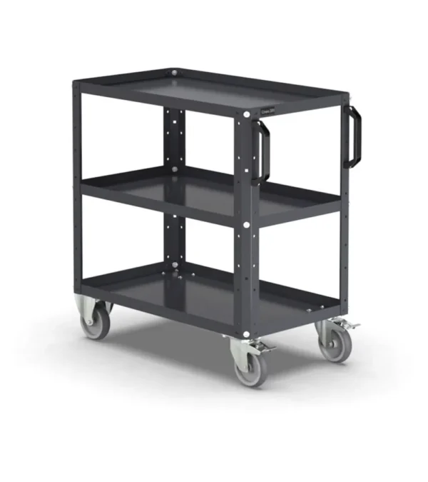 העגלה כוללת 3 מדפים עם שפה מוגבהת, לשמירה על הציוד בזמן תנועה, כאשר המדף האמצעי מתכוונן בגובה להתאמה מלאה לצרכים שונים.