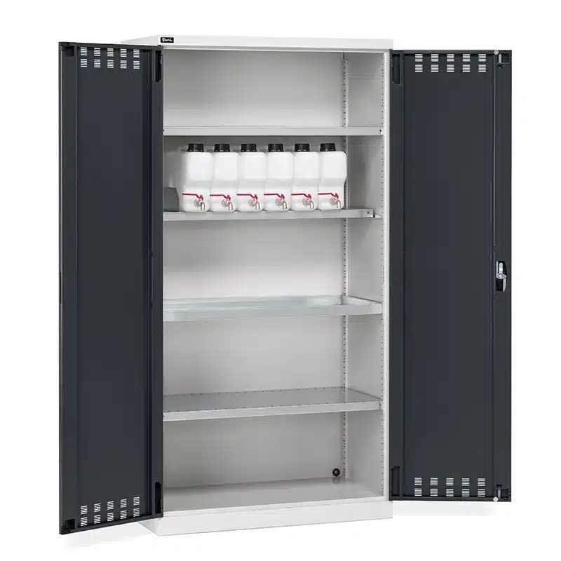 הארון כולל דלתות כנף מאווררות, מדפים ייעודיים עם חורי ניקוז, ו-מכלי איסוף אטומים לנזילות, ומספק סביבת אחסון בטוחה, מסודרת ותקנית.