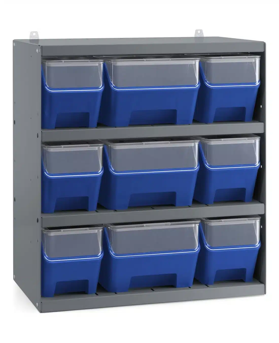 הוא בנוי מפלדה חזקה ועמידה בצבע אפור תעשייתי (RAL 7000), ומספק נגישות נוחה וסדר מלא בסביבת העבודה.