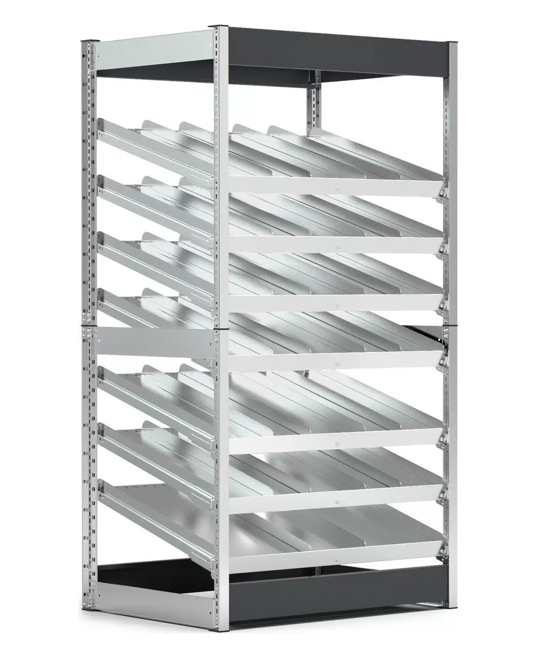 המערכת כוללת 7 מדפים משופעים בעומק 600 מ״מ, המאפשרים גישה קלה ומהירה לתכולה, שיפור תהליכי ליקוט, סדר וניצול מיטבי של שטח.